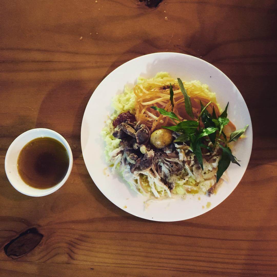 Unlike other Vietnamese noodle soup bowls whose broth will cover the noodles almost completely, Quang noodle broth is barely enough to slurp during the meal. This dish’s ingredients include rice, vegetables and meat. After being soaked in water, the rice is ground to a fine powder and made into attractive smooth white noodles. Accompanying vegetables are water morning-glory, cress, young banana flowers, and herbs. Especially, the famous Tra Que savory of Quang Nam Province will give the dish more flavor.